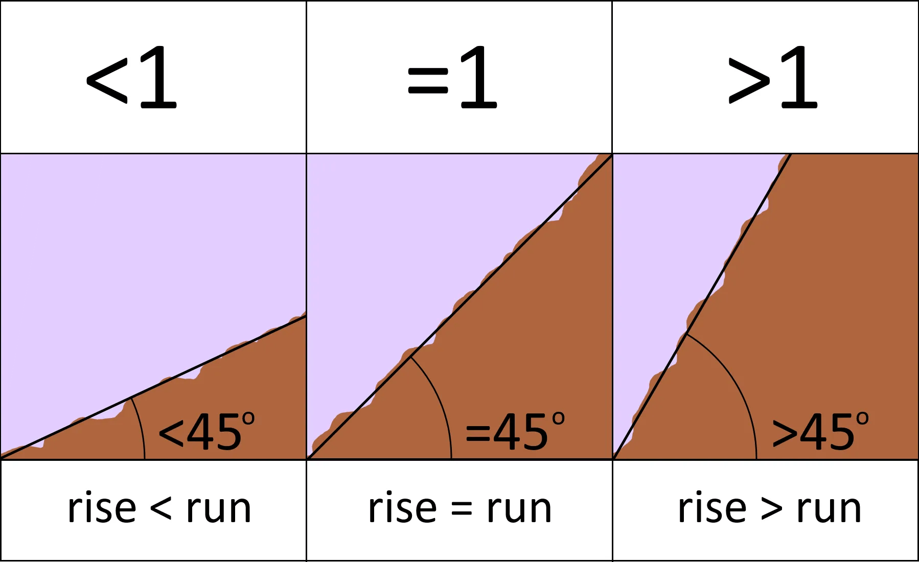 The rise over run formula is quite literally that rise over run as that is how you would calculate the slope of a straight line joining any two points. Ratio 1 in 1 tan a which equals 1 in 1 tan 1 7184 1 in 1 03 1 in 33 333. One could be inclined to assume that a 6 in 12 slope would equal half of that 22 5. All you need to do is calculate the difference between the two points in the vertical direction rise and then divide it by the difference in the horizontal direction run.